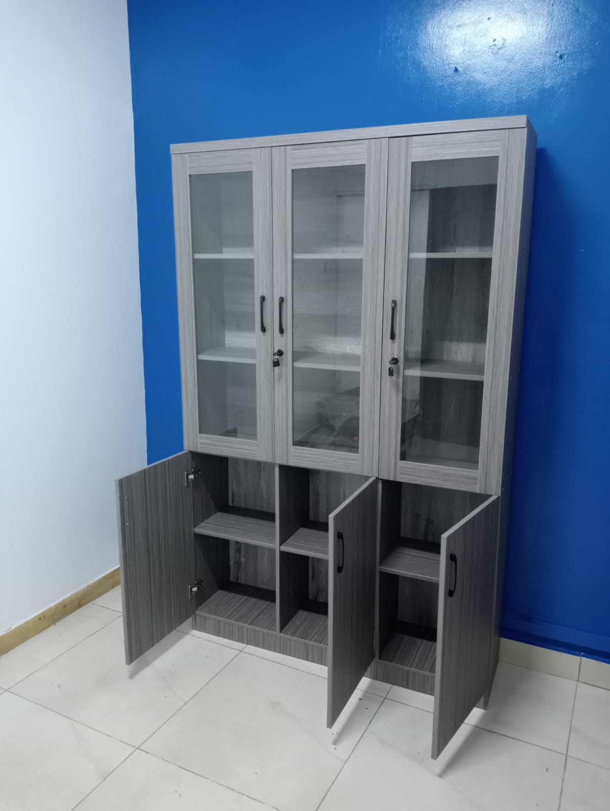 KSh28,500.00Original price was: KSh28,500.00.KSh24,500.00Current price is: KSh24,500.00.Add to cartIt features a sleek design with two glass doors on the top half, offering clear visibility of the contents within. The bottom half boasts two solid metal doors, providing secure storage for confidential files or office supplies. The cabinet is set against a minimalist backdrop with a framed artwork, a potted plant, and sheer curtains, creating a clean and professional aesthetic.