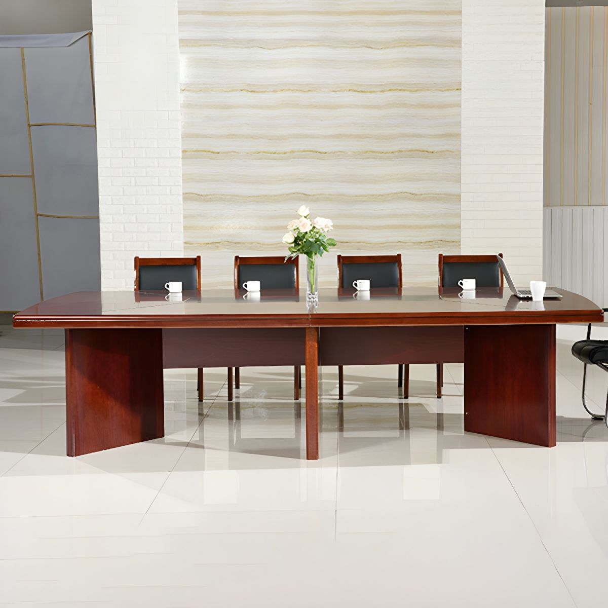 Crafted from high-quality mahogany, the table boasts a rich, polished finish that exudes sophistication and professionalism. Its modern design is complemented by elegant accents, including sleek edges and refined detailing, which add a touch of luxury to your boardroom.