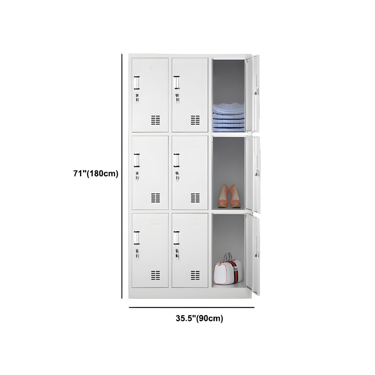 Each of the nine compartments comes with individual doors, allowing users to store items separately, ensuring privacy and organization. The locker features sturdy, lockable doors to secure personal belongings or sensitive documents, making it a perfect choice for shared workspaces. Its minimalist steel design adds a professional touch to any environment, while its compact footprint makes it ideal for maximizing storage without taking up too much space.