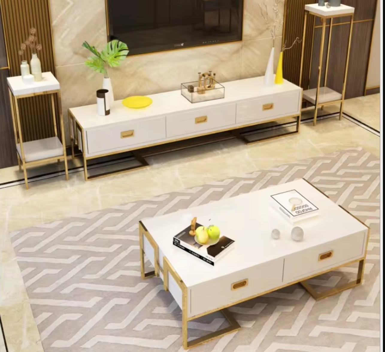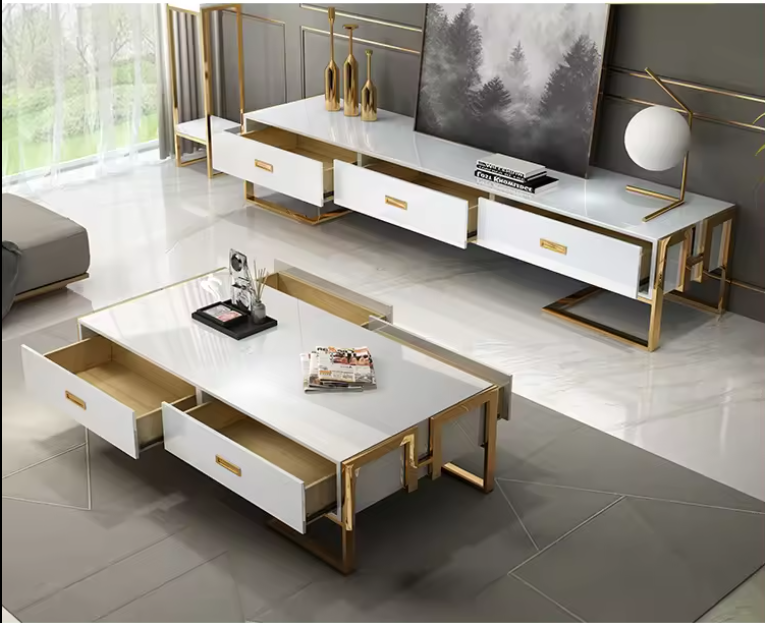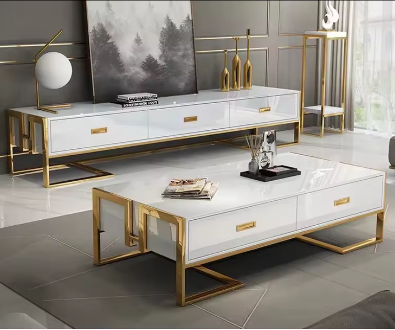 Enhance your living space with our stunning Coffee Table & TV Stand Set. This exquisite set features a sleek white finish complemented by bold gold accents, creating a perfect blend of contemporary style and sophistication. The glass top of the coffee table adds a touch of luxury, while its sturdy base ensures lasting durability. The TV stand offers ample storage with multiple drawers, keeping your space organized and clutter-free.